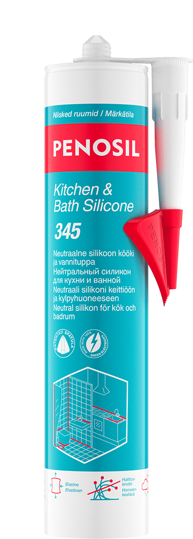 Leikkaa pois patruunan kierteillä varustettu pää, ja kierrä levityssuutin paikoilleen silikonin ohjaamiseksi. Leikkaa kierteillä varustettu pää auki 45° kulmassa tavalla, joka antaa sopivan aukon levitystä varten. Aseta patruuna yhdessä levittimen kanssa pistooliin, ja täytä asennussuutin silikonilla painamalla toistuvasti pistoolin liipaisinta. Levitä silikonia saumaan painamalla toistuvasti ja tasaisesti pistoolin liipaisinta samalla vetäen suutinta tasaisen jatkuvasti saumaa pitkin. Silikonin levittämisen jälkeen tasoita se kumisella silikonilastalla ja poista liika materiaali.