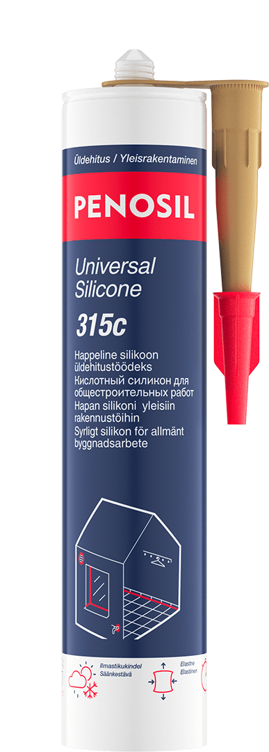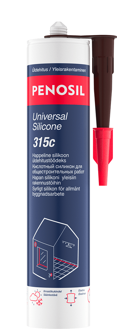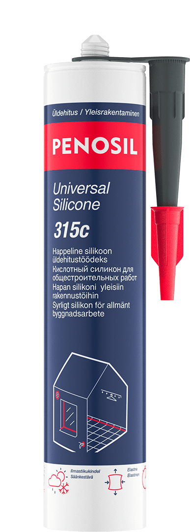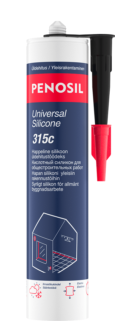 Leikkaa pois patruunan kierteillä varustettu pää, ja kierrä levityssuutin paikoilleen silikonin ohjaamiseksi. Leikkaa kierteillä varustettu pää auki 45° kulmassa tavalla, joka antaa sopivan aukon levitystä varten. Aseta patruuna yhdessä levittimen kanssa pistooliin, ja täytä asennussuutin silikonilla painamalla toistuvasti pistoolin liipaisinta. Levitä silikonia saumaan painamalla toistuvasti ja tasaisesti pistoolin liipaisinta samalla vetäen suutinta tasaisen jatkuvasti saumaa pitkin. Silikonin levittämisen jälkeen tasoita se kumisella silikonilastalla ja poista liika materiaali.